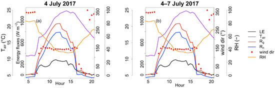 Diurnal cycles at half hourly temporal resolution for latent heat flux (), global radiation (), net radiation (), air temperature (), wind direction and relative humidity (RH). (a) 4 July 2017. (b) Mean diurnal cycles of the same variables, for the period 4–7 July 2017. The morning inflexion is visible in all the panels.