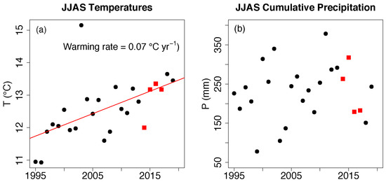 June-to-September (JJAS) period 1995–2019 (data from ARPA-VdA station). (a) Average air temperature. (b) Cumulative precipitation. Red squares represent the 2014–2017 data mean air temperature and precipitation. Black circles represent the same variables but in the other years.