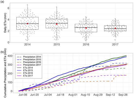 (a) Box plots of daily actual evapotranspiration for each growing season. Whiskers indicate the range within ±1.5 IQR (Interquartile Range), and the horizontal line is the median value. The red dots are mean values. (b) Cumulative precipitation and actual evapotranspiration for the growing seasons in each year.