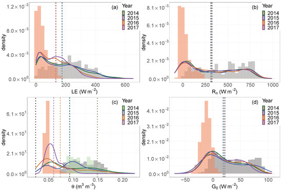Frequency density distributions (in every growing season, JJAS) for: (a) Latent heat flux (). (b) Net radiation (). (c) Shallow volumetric soil water content (, at 10-20 cm of soil depth). (d) Surface ground heat flux (). Dashed lines represent the mean values for each variable in each growing season. Based on 2015 data as an example, light red histograms represent the density distribution of and between 05:00 and 7:00 and between 17:00 and 20:00. The grey histograms refer to the hours between 08:00 and 16:00. For soil water content, the light red histogram refers to the dry period (DOY 185–223). The grey and green histograms are instead related to the wet periods (DOY 164–184 and 224–253, respectively). The dotted lines represent the soil water content at wilting point (black) and at field capacity (brown).