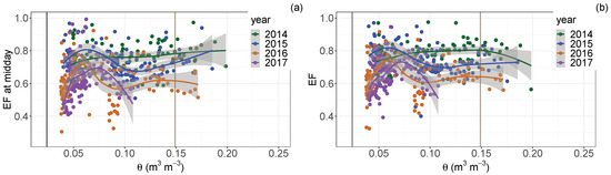 An EF increase with increasing shallow below 0.07 m m was noticed. The trend was less clear for shallow values greater than 0.075 m m, with scattered data. Besides, decreases of EF were found between 0.075 m m and the field capacity (0.149 m m), not reached in 2017. A possible critical shallow was slightly higher than 0.05 m m. However, a dramatic decrease in EF below that point was not observed. An EF increase with soil water content was observed only in 2014 (one of the wet growing seasons). On the opposite, in the 2015 and 2016 growing seasons, an oscillating trend was found. In 2017, an increase below 0.075 m m was found, followed by a decrease for higher values. Using the 40 cm soil water content, the results did not change dramatically (not shown). It should however be pointed out that a relatively superficial soil water content (down to maximum 40 cm of depth) was available. The behaviour of daily average of EF (using only the hours in the range 8:00–15:00) was similar to the EF value extracted at local solar midday (12:00) (Figure 8a,b) in all growing seasons. Differently from theoretical behaviours, using both EF computations, the identification of water and energy-limited regimes was not trivial.