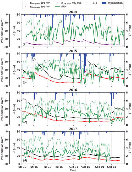 The ETa regime was better identified using the potential evapotranspiration (ETo), estimated via Penman-Monteith equation [84]. The energy-limited conditions were more evident in 2014, when the soil water content at 10 cm of depth was relatively high and the ETa was closer to ETo, if compared to the remaining three growing seasons. In those growing seasons, water-limited conditions were more frequent (Figure 9). The water limitation was evident already in 2015, and mostly in 2016 and 2017. In 2015, the dry period between June and July was also noticeable from the low soil water content at 20 and 40 cm of depth. That period caused a decrease in ETa (consistently lower than ETo). Higher (up to more than 4 mm day) discrepancies between ETa and ETo occurred in water-limited growing seasons (2016 and 2017), when the soil water content decreased to less than 20 equivalent millimetres stored in the soil layers, at 20 or 40 cm of depth.