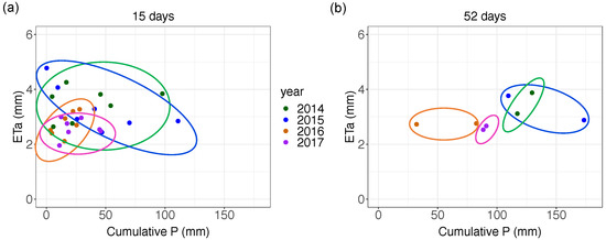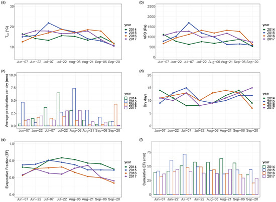 The inter-annual variability emerged in the following findings. The lowest values were found in 2014 in most of the 15-days periods. Variations of more than 5 °C were identified in 15-days periods in different years (Figure 10a). The VPD (Figure 10b) was lower in 2014 by more than 1000 Pa in the period 1–15 July, if compared to 2015. Year 2015 showed enhanced VPD due to the wide period with high air temperature and without precipitation, as also illustrated in Figure 10c,d, where the average precipitation per day and number of dry days are shown, respectively. An important decrease in average EF (Figure 10e) and cumulative ETa (Figure 10f) was noticed in the same—but drier—periods of years 2016 and 2017 if compared to wetter years 2014 and 2015, because of lower water availability and despite a high VPD. During the long dry spell of 2015 (June–July), and especially in the first decade of July, and VPD were sufficiently high to cause a peak of EF (and ETa), despite relatively low water availability. In addition, periods with wet conditions (e.g., 30 June–15 July 2014) could experience high EF and ETa, even with relatively low and VPD. The major EF difference (0.2) was found in the two 15-days periods of September 2016 and 2017 if compared to the other two growing seasons. This finding was coherent with ETa, which showed reductions of about 10 mm in the same aforementioned periods. ETa inter-annual differences could be greater than 15 mm, and the highest EF and cumulative ETa were found in 2014 in 4 out of 8 periods.