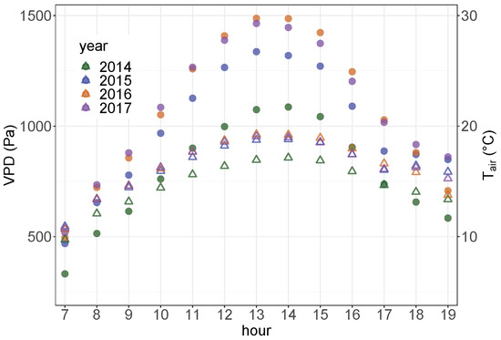 VPD (circles) and air temperature (triangles) during the daytime hours between 7:00 and 19:00 from 2014 to 2017 growing seasons.