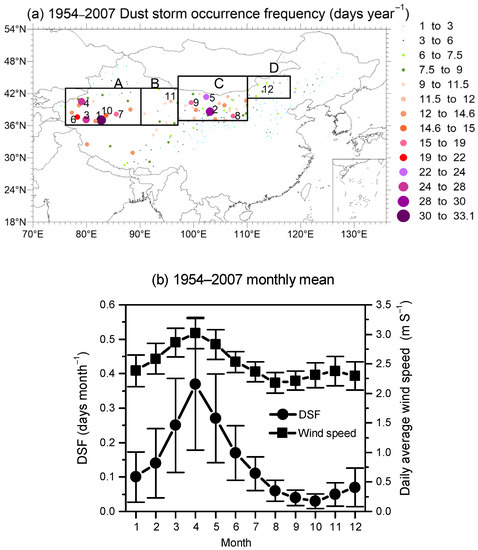 3.1. Climatological Mean of Dust Storm Occurrence Frequency over China