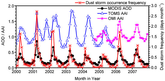 3.2. The Comparison of MODIS AOD and TOMS/OMI AAI with DSF