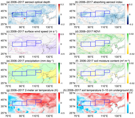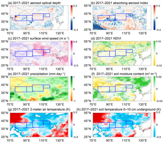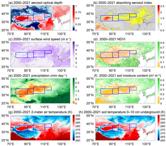 | DSF, AOD, and AAI | Surface Wind Speed (ms−1) | NDVI | Surface Soil Moisture Content (m3m−3) | Precipitation (mmday−1) | 2-m Air Temperature (K) | Soil Temperature 0–10 cm Underground (K) |