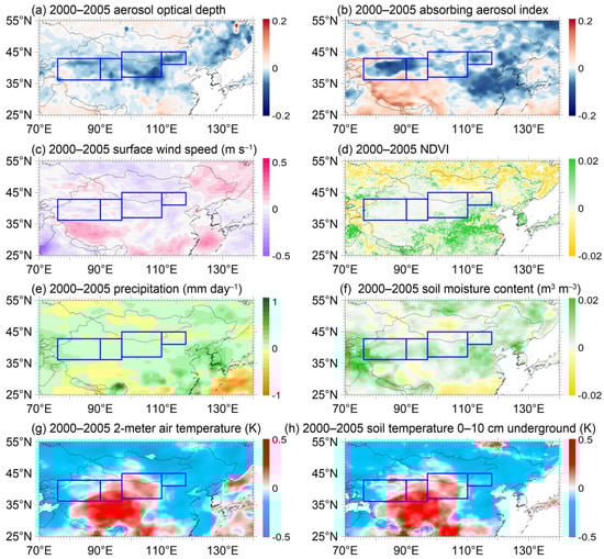 | Year | Source Regions | DSF (daysyear−1) | AOD | AAI | Wind (ms−1) | NDVI | SFMC (m3m−3) | Precipitation (mmday−1) | T2m (K) | TSoil1 (K) |