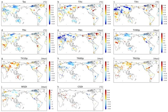 Under SSP1-2.6 scenario, the multi-model ensemble spatial patterns of the impact of land use change (i.e., ssp126-ssp370lu−ssp126) on future temperature extremes. Extreme climate indices are averaged over 2070–2099. Only grid points where at least 70% of the selected CMIP6 models simulate the same anomaly sign are shown. (a) mean temperature, (b) TXx, (c) TXn, (d) TNx, (e) TNn, (f) TX90p, (g) TX10p, (h) TN90p, (i) TN10p, (j) WSDI, (k) CSDI.