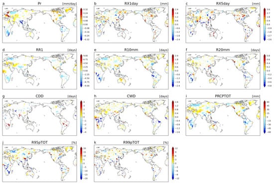 Similar to Figure 1 but for multi-model ensemble spatial patterns of the impact of land use change on future precipitation extremes. (a) mean precipitation, (b) RX1day, (c) RX5day, (d) RR1, (e) R10mm, (f) R20mm, (g) CDD, (h) CWD, (i) PRCPTOT, (j) R95pTOT, (k) R99pTOT.
