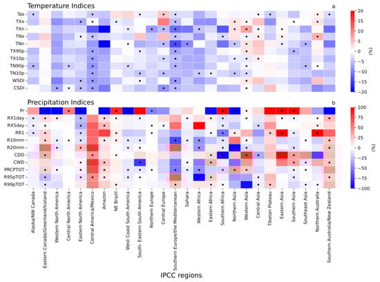 Under SSP1-2.6 scenario, the multi-model ensemble relative contribution of land use change (i.e., ssp126-ssp370lu−ssp126) to future changes in regional temperature extremes (a) and precipitation extremes (b); relative contributions are calculated relative to future regional projections with all other anthropogenic forcings for each of the extreme climate indices (see Methods). The 26 regions selected are defined by IPCC AR5 Reference Regions (Supplementary Materials Figure S4). A black dot is added when at least 80% of models simulate the same change sign in the region.