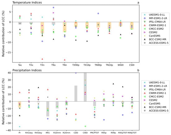 Under SSP1-2.6 scenario, the multi-model ensemble global-averaged relative contribution of land use change (i.e., ssp126-ssp370lu−ssp126) to temperature extremes (a) and precipitation extremes (b); relative contributions are calculated relative to future global projections with all other anthropogenic forcings (see Methods). Extreme climate indices are averaged over 2070–2099. Light yellow bars correspond to at least 80% of models simulating the same global change sign.
