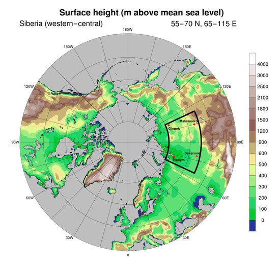 Orography with height in meters of the Northern Hemisphere (≥40). The black box (55–70, 65–115) shows western–central Siberia, further referred to as Siberia. Red dots indicate the location of the four stations: Nadym (, ), Olenek (, ), Maksimoro (, ), and Severnoe (, ).