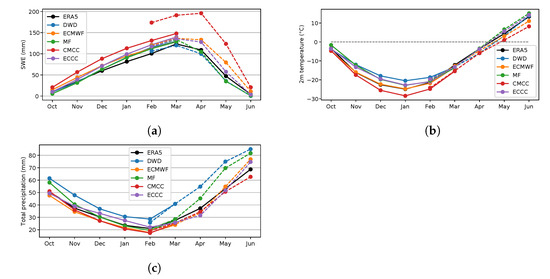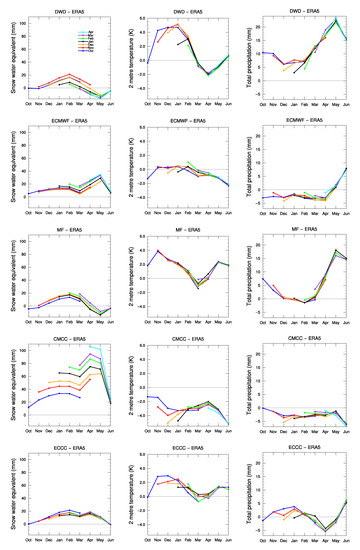 From Figure 2 and Figure 4, we see an SWE overestimation from all systems except DWD and MF in late spring. The remarkable initial overestimations of SWE by CMCC have already been discussed in the previous section. However, additionally, during the simulations, these initial biases persist until the snow eventually melts completely at some time in late spring. The wintertime 2-m temperatures are overestimated by DWD, MF, and ECCC by 3 K to 4 K, whereas biases for March and April are small or negative. CMCC has an opposite pattern, with negative biases of about −3 K in late winter, and ECMWF is mostly close to the reference but with a negative bias in late spring. Towards spring, DWD and MF overestimate precipitation, with DWD having the highest bias. ECMWF and CMCC show only small precipitation underestimations during wintertime.