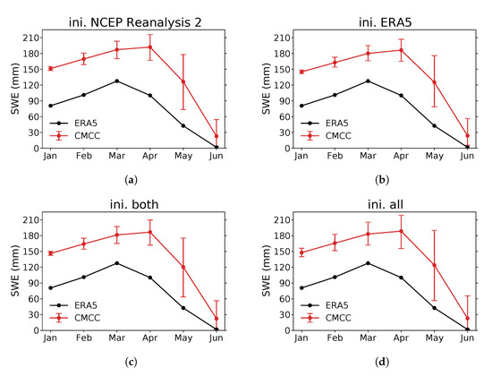 Average monthly SWE from 1993 to 2016 over Siberia from ERA5 (black) and CMCC (red). The red line represents the ensemble mean, and bars show the ensemble minimum and maximum averaged over the years and region. Panel (a) shows the sub-ensemble where only NCEP Reanalysis 2 was used to generate the indirect land initial conditions; (b) where only ERA5 was used; (c) a linear combination of both; and (d) the whole ensemble (sum of the previous).