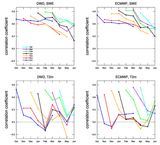 Pearson correlation for SWE and 2-m temperature of monthly data from hindcasts (1993 to 2016) with ERA5 as reference. Values were first averaged over the region before calculating the Pearson correlation coefficient. Colors indicate different starting months.