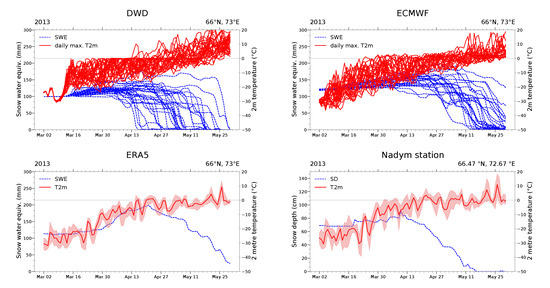 Top: daily snow water equivalent (blue) and daily maximum 2-m temperature (red) for each ensemble member of DWD and ECMWF. Bottom: daily snow (blue), daily mean temperature (red line), and daily min/max temperature (red area) from ERA5 and Nadym station (snow given as snow depth).
