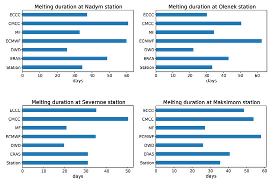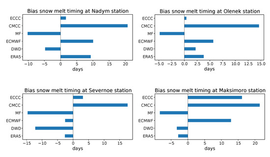 At the stations, the snowmelt duration (from the maximum to one-third) lasts slightly more than one month, which is shown in Figure 7 at the bottom of each sub-figure. DWD and MF are melting too early and too fast at the selected stations (see Figure 7 and Figure 8), which can also be seen from their small underestimation in April and March (Figure 4), whereas ECMWF and CMCC are too late and are taking too long in the melting process. The reason might be the general overestimation from CMCC (see Figure 2), because it takes longer due to having more snow to melt. The gridded reference ERA5 also melts too slowly at three stations, but not as slowly as the previous two.