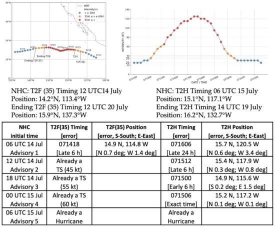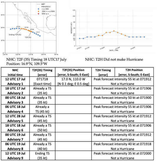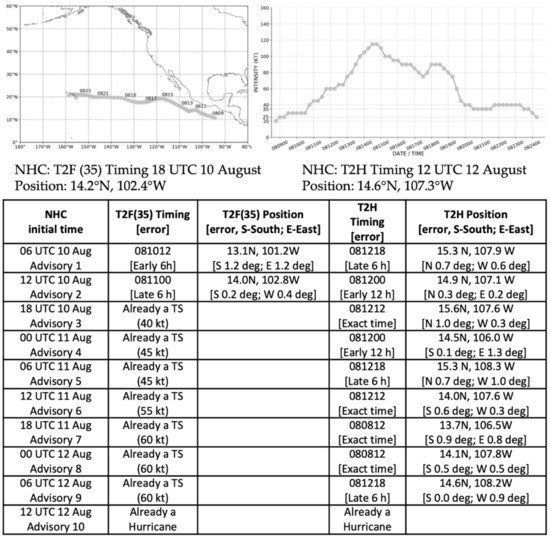 As indicated in Table 1, Felicia was the second hurricane of the 2021 eastern North Pacific season. Felicia followed Enrique by almost 3 weeks, and it was also a tropical storm at the time of the first NHC advisory at 09 UTC 14 July (Cangialosi 2021) [10]. Tropical Storm Felicia rapidly intensified to a hurricane just 24 h after the first advisory (Table 1, column 6). Using the advisories at synoptic times (Figure 7) so that the NHC forecasts of T2F(35) and T2H can be evaluated, the T2F(35) timing error in the first advisory (row 1) was only 6 h late (column 2), but the T2F(35) longitudinal error was a surprisingly large 1.4 degrees to the west (column 3). In that first advisory, the NHC did not forecast a rapid intensification—rather, their T2H of 06 UTC 16 July was 24 h late (column 4). Consequently, their T2H longitude error was 3.4 days to the west (column 5). However, when the initial intensity had increased by 10 kt after only 6 h (column 2, row 2), the NHC forecasts of the T2H timing were within 6 h of the exact time for Advisories 2–4 (column 4). Consequently, the T2H position errors (column 5, row 2) were also smaller. Again, these T2F(35) and T2H forecasts can be so accurate when the NHC waits until pre-Felicia is already a TS in the first advisory (Table 1).