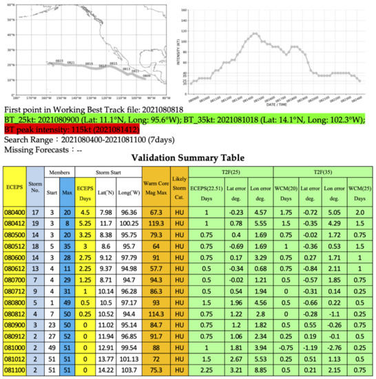 In this original validation summary format of Elsberry et al. [1], the T2F(25 kt) based on the weighted-mean ECEPS vortex intensities of the ensemble storm members was provided in columns 10–12 as well as the WCM-based T2F(35) that is the focus in this study. Note that the pre-Linda T2F(25 kt) errors in column 10 are almost all less than 1.0 days. Furthermore, the T2F(25 kt) latitude errors in column 11 for this westward-moving pre-Linda track are also mostly small. However, the T2F(25 kt) longitude (i.e., along-track) errors are much larger than the latitude errors. These large along-track errors may also be related to the absence of some bogus vortex initialization procedure for the ECEPS, which would have adjusted the initial vortex positions toward updated satellite fix positions. Another change from the original validation summary format of Elsberry et al. [1] in Figure 2 is in the specification of the WCM = 20 threshold for the T2F(35) timing and position in columns 13–15, which was based only on the Hurricane Kiko evaluation. Based on the evaluations of the ECEPS forecasts for the eight hurricanes in the eastern North Pacific during 2021, an alternate WCM = 25 threshold for the T2F(35) and WCM = 37 for the T2H were adopted. For this pre-Linda case in which the intensity increased rapidly from 30 kt, the T2F(35) timings with the WCM = 25 threshold (column 16) were identical to the timings with the WCM = 20 threshold (column 13). While the smaller WCM = 20 threshold (earlier achievement of T2H (35 kt)) timing and associated position was retained in this study for some slower-developing tropical storms, the larger WCM = 25 threshold for the T2F(35) was generally adopted for the 2021 season summary.