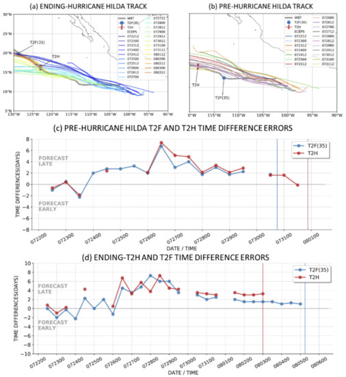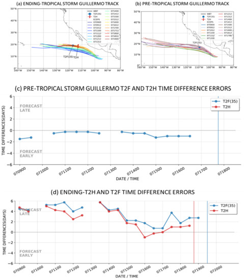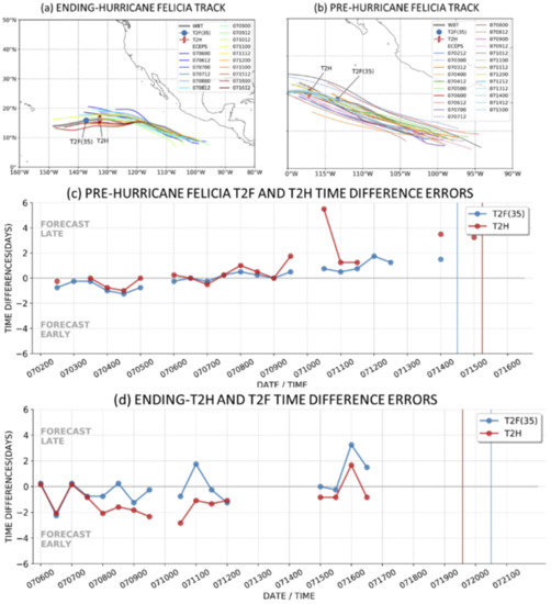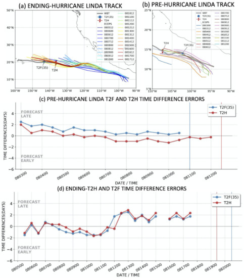 The ending stage of the Hurricane Linda lifecycle track forecasts are shown in Figure 3a. The earliest of these tracks that have predicted an ending T2H and ending T2F(35) begin around 6 August, which is two weeks in advance of that ending T2H. These earliest tracks predict well the first 10 days but miss the southward dip in the Linda track west of 120 °W, and thus, they propagate too far north over cold water and decay too early. The later forecasts correctly predict that southward track dip and have very accurate tracks until the ending T2F(35) near 150 °W. The ending-T2H and ending-T2F(35) timing forecast errors are provided in Figure 3d. The earlier forecasts tend to have ending-T2H and ending-T2F(35) timing errors that are 1–2 days early. As discussed earlier in Section 2.4, after 00 UTC 12 August, the later forecasts have ending-T2H and ending-T2F(35) timing errors that are 1–2 days late, and thus, they predicted that Hurricane Linda would have approached closer to Hawaii (Figure 3a) before decaying (i.e., a late timing error with a westward track would be too far west).