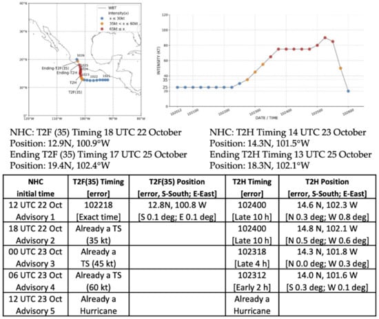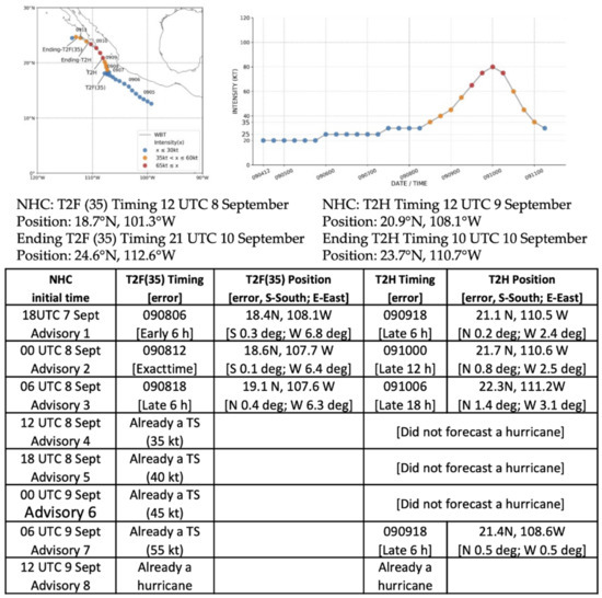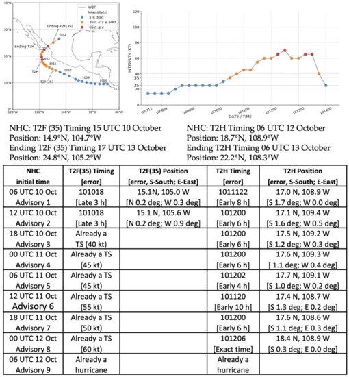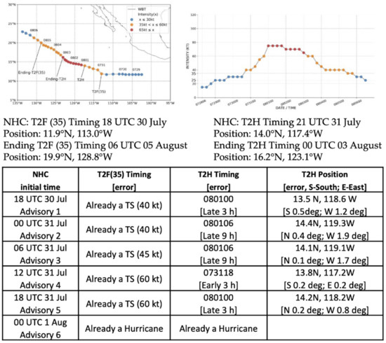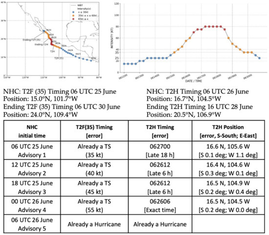 As indicated in Table 1, Enrique was the first hurricane of the 2021 season in the eastern North Pacific following four Tropical Storms [7]. Actually, Enrique was already a tropical storm at the time of the first NHC Advisory at 09 UTC 25 June, so the time difference between the first advisory and the T2F(35) was 0 h (column 4, Table 1). Tropical Storm Enrique then rapidly intensified to a hurricane in 24 h (column 6, Table 1).