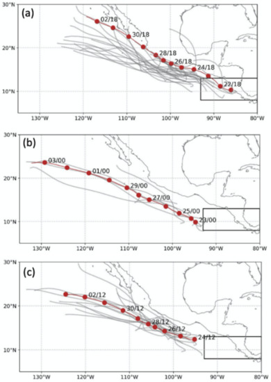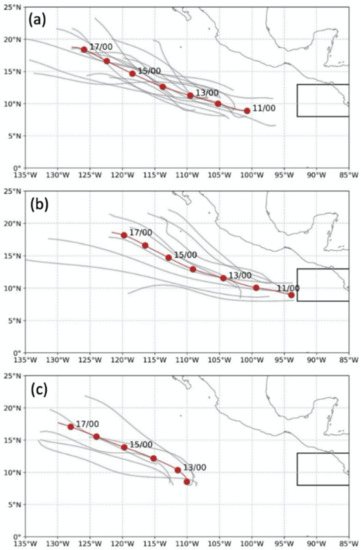 For this study, the solution was to exclude any ensemble member tracks within the small box (8–13 °N; western boundary at 93 °W) in the lower right of each panel of Figure 5. With this Caribbean FA exclusion procedure (panel c), the Storm 12 WMVM track forecast starts later (12 UTC 24 June) and nearly 10 degrees longitude to the west of Storm 4 in panel a, and to the north of Storm 5 in panel b. Although the new Caribbean FA procedure results in fewer ensemble member tracks in panel c due to the omission of the member tracks that originate within the small box in panel a, the track spread in panel c is smaller and the WMVM track “goes down the middle” of that track spread. Thus, the new procedure is applied to greatly reduce the number of ensemble storm tracks in the eastern North Pacific that originate from Caribbean FA circulations.