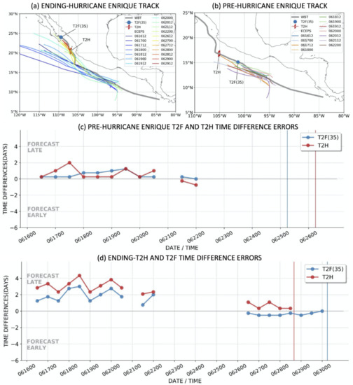 The first pre-Enrique ECEPS forecast from 12 UTC 16 June also included the ending-T2H and the ending-T2F(35) timings and positions along the WMVM tracks (Figure 6a). As indicated in Figure 6d, the ending-T2H timing errors were 2–4 days late from 12 UTC 16 June through 00 UTC 22 June, which can be attributed to the WMVM track forecasts that continued along a northwestward path to decay over a cooler ocean north of 20 °N. It was only the ECEPS forecasts after 12 UTC 26 June that predicted the Enrique turn toward the west coast of Mexico (Figure 6a) that led to an ending T2H of 16 UTC 28 June, which was then accurately predicted (Figure 6d). These ending-T2H and ending-T2F(35) errors emphasize the importance of accurate track forecasts.