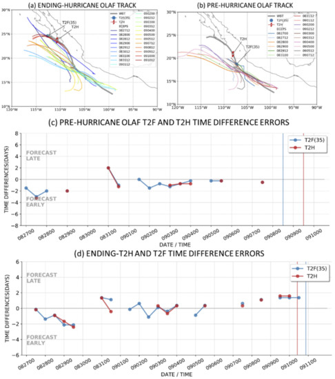 Summary of the ECEPS pre-formation and ending-stage predictions of the Hurricane Linda (2021) lifecycle. Track forecast initial times (MMDDHH) are indicated in the insets for the (a) ending stage and (b) pre-formation stage, and the T2F(35) and T2H timing errors for the pre-formation and for the ending-stage are displayed in panels (c,d).