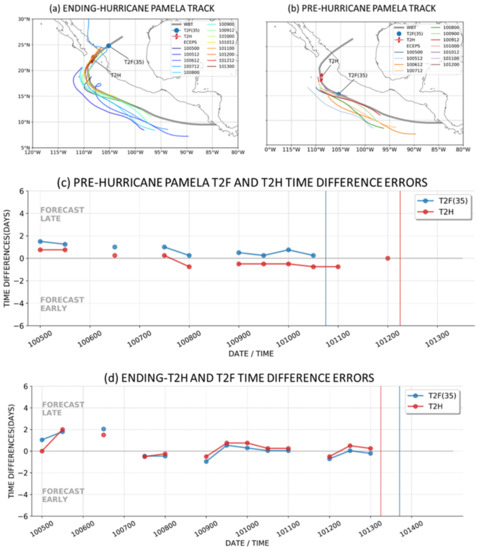 The ECEPS forecasts that also predicted the ending T2H in association with the landfall of Hurricane Pamela are shown in Figure 15a. Note that the starting positions for these ending-T2H forecasts are identical to the starting positions for the pre-formation T2H forecasts in Figure 15b, because the ending-T2H time of 17 UTC 13 October is only 35 h after the pre-formation T2H time. The key to an accurate ending-T2H time for Hurricane Pamela is a highly accurate track forecast in Figure 15a that correctly turns Hurricane Pamela toward the coast around 18 °N, 110 °W and predicts well the landfall position. It is noteworthy how small the track spread among these ECEPS members is following the turn toward the coast, and that this turn on 12 October is being predicted by the ECEPS as early as 7 days in advance. The most important result in Figure 15 is the incredibly small ending-T2H and ending-T2F(35) timing errors in panel d. From the 12 UTC 7 October through the 00 UTC 13 October ECEPS forecasts, the ending-T2H timing errors are <12 h, which demonstrates the exceptional accuracy of both the WMVM track forecasts and the predicted WCM evolutions along those track forecasts. These pre-formation and ending-storm forecasts of the Hurricane Pamela lifecycle from a disturbance 6 days in advance of TS formation through landfall 9 days later on the west coast of Mexico are one of the best examples of this opportunity for improved warnings from the ECEPS forecasts.