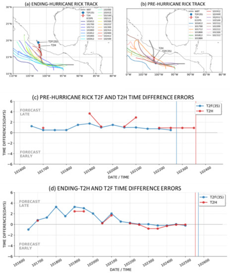 Hurricane Hilda (Table 6, row 4) is an example of a less successful ECEPS performance. The pre-Hilda track forecasts had larger spread, which may have contributed to the tendency for the T2F(35) forecasts to mostly be 2–3 days late. Even though those ECEPS forecasts that had included the ending-Hurricane Hilda period were excellent (including a late track bifurcation), some of the ending-Hilda timing errors were as large as 4–7 days late and then only improved to 3 days late approaching the T2H time. Hurricane Olaf (Table 6, row 5) is another example of a less successful ECEPS performance. In contrast to the Hilda performance timing deficiency, the Olaf performance deficiency was in the track forecasts with large initial position spreads, and then, there was a failure to predict the turn toward the coast that led to a landfall. Nevertheless, starting from 12.5 days in advance of the T2F(35), the ECEPS forecasts of the T2F(35) timing were very accurate (Table 6, row 5, column 2). This ECEPS forecast accuracy continued for the ending-Olaf timing even though the landfall was not correctly forecast, because the non-landfall forecasts had Hurricane Olaf passing over a cooler ocean region, and thus, decay coincidentally occurred at the same time as the actual landfall decay.