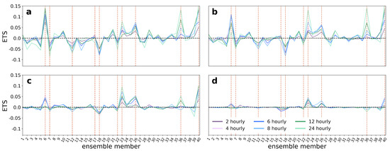 (a) Equitable threat scores for a rainfall rate threshold of 1 mm/h. Hourly periods are differentiated by different colors, which are defined in the legend in panel (d). The five best performing and five worst performing ensemble members are highlighted by vertical dashed orange lines. (b) As in (a) for a rainfall rate threshold of 2 mm/h. (c) As in (a) for a rainfall rate threshold of 5 mm/h. (d) As in (a) for a rainfall rate threshold of 10 mm/h.