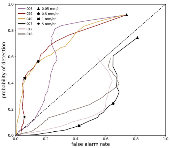 Relative operating characteristic curves for the three best and three worst performing ensemble members. Different rainfall rate thresholds are marked on the single best and worst members only.