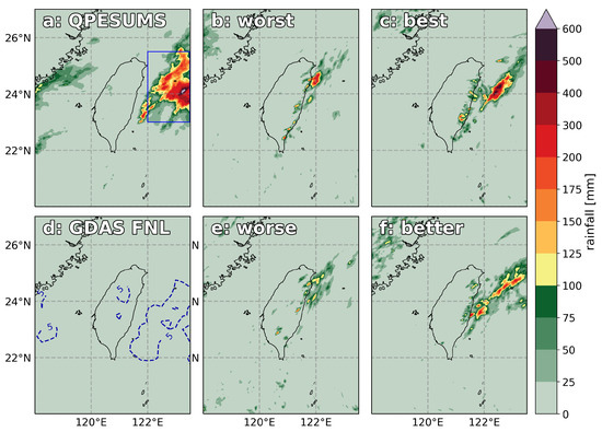 Panels b, c, e, and f in Figure 3 show the 24-h rainfall totals produced in the WRF ensemble run initialized at 12 UTC 8 June 2020 for the worst member (b), the best member (c), the worse member (e), and the better member (f), as determined by forecast verification metrics. Panel a shows the QPESUMS observed rainfall totals. Panel d shows the rainfall totals from the GDAS FNL 24-h forecast, with dashed blue contours outlining areas that received greater than 5 mm of rainfall as the accumulated rainfall does not surpass the first threshold on the colormap. The GDAS FNL 24-h forecast produced little to no rainfall. All members fail to accurately replicate rainfall in the location of the >600 mm peak shown in the observations, both in magnitude and location. The best member most accurately captures the intensity and orientation of the rainfall from the primary rainband, and the better member similarly captures the orientation but does not produce as much rainfall as the best member. The worst and worse members both fail to capture the intensity and location of the primary band of rainfall, where the rainfall is too weak, too far north, and too close to Taiwan’s coast. The worst and worse members do, however, capture the orientation of the storm’s movement (shown in the diagonal streaking/direction of the rainfall totals).
