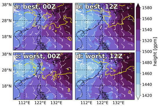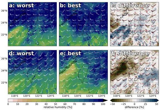 At 700 hPa at 00 UTC, the best member has RH values that are up to 20% greater just below the region of interest and more predominantly southwesterly flow, allowing moister air to be advected into the region (Figure 10c). The worst member, however, has slightly stronger (5 kt), more southerly flow and drier air south of the region of interest, which causes the drier air to be more quickly advected into the region of interest. At 12 UTC (Figure 10f), there is slightly drier (10% less relative humidity) air in the best member in the area of interest closer to Taiwan’s west coast but moister air near 122.5 E near Yonaguni, which could be indicative of the location of existing storms at this time.