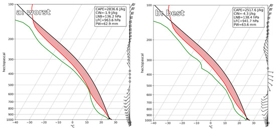 (a) Box-average sounding calculated over the red box in Figure 4 for the worst member at 12 UTC. The green line represents dew point temperature, the red line represents temperature, and the black line traces the sounding. The lifted condensation level (LCL) is marked by a black dot. Convection available potential energy (CAPE, shaded in red), convective inhibition (CIN), the level of neutral buoyancy (LNB), the level of free convection (LFC), and precipitable water (PW) are listed on the sounding. Wind barbs along the right side of the plot show zonal/meridional winds in units of knots. (b) As in (a) for the best member.