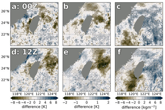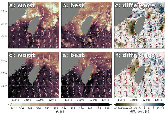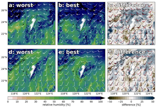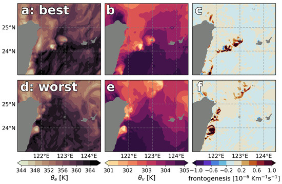 There is ample moisture in the area of interest for lifting mechanisms to trigger deep, moist convection, particularly when interacting with a low LFC as shown in the soundings in Figure 6. At 00 UTC, there is an intrusion of warm, moist air near 122 E, 24 N in the best member, which creates a strong gradient (on the order of 15 K) in the area of interest between the intrusion and the colder, drier air mass just northeast of Taiwan (Figure 7). In the worst member at 00 UTC, the gradient is not as strong and the colder, drier air mass hugs the coast of Taiwan rather than extending eastward as it does in the best member. The combination of the weaker warm, moist intrusion and the less extended cold, dry air mass in the worst member creates a weaker north–south gradient in the area of interest. By 12 UTC, the gradient in the worst member has been pushed north/northwest out of the area of interest by the stronger southerly winds and becomes confined along Taiwan’s coast, while the gradient in the best member has remained in the area of interest and has retained its strength, though its spatial spread is smaller. These differences are highlighted in panels c and f, which show the differences between the fields at 00 UTC and 12 UTC. The cooler air in panel f shows that the gradient in the best member is more prominent than in the worst member at 12 UTC, suggesting that the air mass is either significantly cooler, closer to the surface, or both. Notably, the 100-m winds in panel f are quite similar between the best and worst member, but this does not have a large impact on the air mass and storm progression because the system has already set up and is producing heavy rainfall at this point in time in reality.