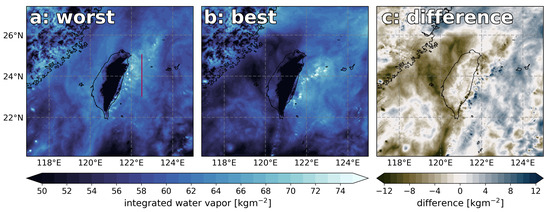 At 12 UTC, the worst member and the best member have similar maximum values of integrated water vapor, but these maximums are displaced (Figure 8). The best member’s maximums are within the region of interest and peak above 75 kg m, while the maximum values in the worst member are closer to 70 kg m and are confined along Taiwan’s coast. Panel c in Figure 8 shows the difference between the best and worst member. The negative values north of and positive values within the region of interest highlight this displacement of moisture well. North of the region of interest, the worst member is more moist than the best member, but within the region of interest the best member is more moist than the worst member. Integrated water vapor values in the high 60 s and low 70 s kg m indicate large quantities of moisture to begin with but differences on the order of 8–10 kg m are non-negligible. In both members, the cells move eastward and northeastward off of the coast of Taiwan, so the drier air in the worst member over the region of interest inhibits the formation of deep, moist convection, while the moisture in the best member promotes the formation of deep, moist convection and reflects the presence of clouds that have already developed.