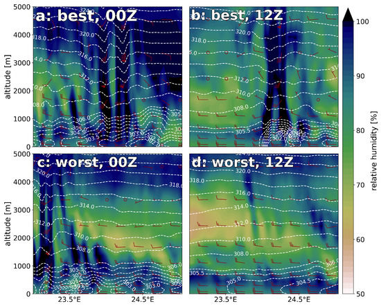 (a) Vertical cross-section of relative humidity (shading) and (white dashed contours) taken along the red line in Figure 8 for the best member at 00 UTC. Meridional/vertical wind vectors in units of knots are plotted in red wind barbs, with the vertical component multiplied by a factor of 10 to highlight vertical motion. (b) As in (a) at 12 UTC. (c) As in (a) for the worst member at 00 UTC. (d) As in (a) for the worst member at 12 UTC.