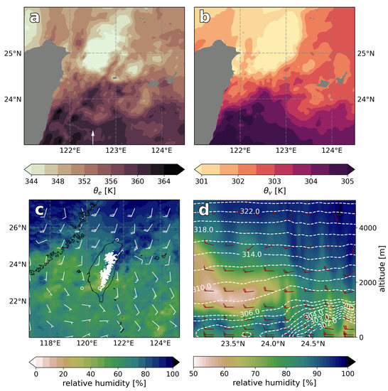 where is the potential temperature at the lifted condensation level (LCL), is the temperature at the LCL, and r is the mixing ratio. Plots of 100-m temperature and moisture (not shown here) suggest that the moisture contribution to variability dominates so we will focus on as a measure for moisture going forward. We choose 100 m to show plots of (and later and frontogenesis) as it is a representative layer of air that is typically lifted in buoyant plumes of convection [41]. Gradients in at 100 m above the surface can thus be used to identify near-surface boundaries in moisture and buoyancy but are not as valuable in identification of near-surface fronts (we will employ virtual potential temperature () for that purpose later on) [42].