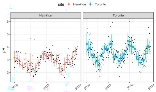 Aerosol pH (black dots) and monthly average pH in Hamilton (red) and Toronto (light blue) over the period of 2016 to 2019. Error bars are standard deviation of monthly pH distribution at the two sites.