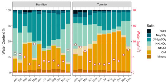 Particle liquid water content (LWC) is a key parameter that determines the partitioning of semi-volatile inorganic species and pH (e.g., Nenes et al., 2020 [9]) and depends on the RH, temperature, and the equilibrium aerosol composition. Some chemical species in the aerosols are more hygroscopic than others, such as chloride salts, but the main driver of LWC is often SO42− as it is in larger amounts compared to the other inorganic aerosol species. Large amounts of SO42− contribute also to increase the H+ concentration leading to strongly acidic aerosol [5,8]. Other atmospherically relevant ions such as NH4+ and NO3−, nonvolatile cations (NVC: Na+, K+, Mg+2, and Ca+2), and OM also contribute to particle LWC, without increasing the acidity considerably; therefore, they tend to elevate the aerosol pH [8]. In Figure 3, the monthly average contribution of particulate inorganic salts and organic fraction to the LWC, as predicted by ISORROPIA-lite, are reported for Hamilton (left) and Toronto (right) and expressed as percentage of water speciated for chemical species. LWC in Hamilton is largely dominated by the inorganic fraction throughout the year with NH4NO3 contributing up to 40% from November to February and dropping down to less than 10% during the rest of the year and (NH4)2SO4 contributing to the 25% from November to February and up to 55% from March to October. The contribution of the PM organic fraction to LWC remains below 30% throughout the year. In Toronto, the organic fraction contributes up to 65% to the LWC with the highest values seen between May and November; this is followed by (NH4)2SO4, which contributed 20–30% to LWC in the same period. Although organics remain an important contributor taking up between 20 and 35% of the water from December to March, the major contributor to particle LWC in this period is NH4NO3 (~40%). Other inorganic salts such as (NH4)2SO4, NH4Cl, Na2SO4, and NaCl contribute to about 12, 8, 6, and 2% of water, respectively, in the same period. The plots in Figure 3 report also the absolute amount of water in red circles on the right y-axis. In both sites, aerosol LWC is high from December to March and low during the rest of the year with Toronto presenting a stronger seasonality compared to Hamilton. During the winter months, the temperature is on average about 0 °C and rises up to an average of 16 °C during the remaining months. Together with water vapor condensation, low winter temperatures favor the partitioning of semi-volatile inorganic species such as NH3 and HNO3, which in turn contributes to increasing the LWC. As a result of these two combined effects, particle LWC reaches its maximum during winter months and its minimum during summer when the non-volatile organic fractions are the main aerosol component.
