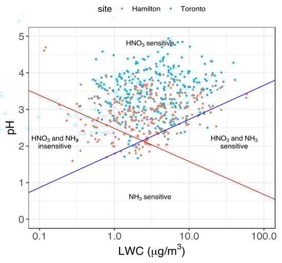 In their framework, Nenes et al. [9] applied equation 1 to determine a “characteristic pH” for NH3 and HNO3 as a function of air temperature, relative humidity, pH, and LWC, which is associated with a shift in sensitivity of aerosol mass to changes in NH3 and HNO3. The characteristic pH is described as for HNO3 and for NH3, where and . The parameters and are arbitrary threshold factors set equal to 0.1 under the assumption that aerosol responds to changes in NH3/HNO3 when at least 10% of the gas-phase precursors is partitioned to the particle phase. Figure 4 shows the aerosol sensitivity map resulting from the application of the framework to the Hamilton and Toronto datasets. The “characteristic pH” for NH3 (blue diagonal line) and HNO3 (red diagonal line) are calculated as a function of aerosol LWC, considering an average temperature (11 °C) and relative humidity (68%) from the combination of the two datasets. In Figure 4, daily aerosol pH is reported against the corresponding LWC value for Hamilton (red) and Toronto (light blue). In both sites, all points lay almost entirely above the red line, indicating that these combinations of aerosol pH and LWC favor further HNO3 molecules to be partitioned in the particle phase as NO3−. Points laying also above the blue line indicate conditions of pH and LWC that favor NH3 to the gas phase.