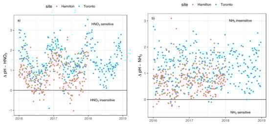 Based on ΔpH reported in Figure 5a,b, the particulate matter sensitivity to the gas phase HNO3 and NH3 is different at the two sites over the same period. The aerosol is insensitive to both compounds for ~10% of the sampling days in Hamilton, whereas this value drops to 2% in Toronto given the higher pH at this site.