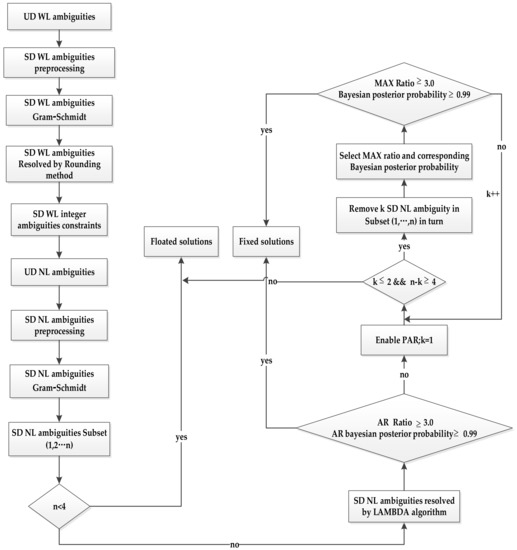 The fixed SD EWL ambiguities are considered as virtual observations to constrain other estimated parameters and the variance–covariance matrix, thereby enhancing the fixing of SD WL and NL ambiguities. Similarly, the fixed SD WL ambiguities are also pseudo-observations to update the remaining unknowns and variance–covariance matrix in order to strengthen the fixing of the SD NL ambiguities once again. Then, the independent SD NL can be obtained after applying the quality control strategy and Gram–Schmidt method.