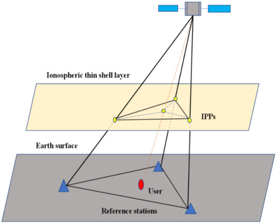 Figure 2 shows the geometric relationship between the location of the user and reference stations when utilizing the DIM method to interpolated atmospheric delays. The slant ionospheric correction of a given satellite (s) visible to the user can be interpolated by utilizing the slant ionospheric delays of the same satellite visible to the reference stations. When atmospheric corrections/variances are available for a certain epoch, the user can use them to enhance the PPP-RTK performance.