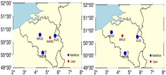 To validate PPP-RTK performance, five stations were used in this study. These stations belong to the European reference frame (EUREF) Permanent GNSS Network (EPN), while those stations in Belgium, which are able to track multi-frequency observations. The observations condition of this reference network supplies a very good opportunity to assess PPP-RTK performance based on three-frequency observations. The station distributions are shown in Figure 3. In Figure 3, the reference stations marked by blue circles are used to estimate atmospheric corrections, whereas the red circle is considered as a user station to evaluate PPP-RTK performance. The average distance between the user positions and reference network varied from 30 to 100 km.