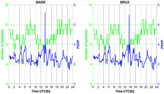 Figure 4 shows the number of satellites and position dilution of precision (PDOP) from the WARE and BRUX stations. The number of satellites varied from 7 to 13. The PDOP value ranged from two to four most of the time. Of course, there is an abnormal result of the PDOP between 12 and 14 h, and the number of satellites was relatively small at this time.