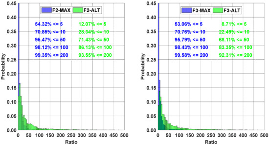 It can be seen that the 54.32% of ratio distribution was under 5 for the F2-MAX, and 12.07% of the ratio distribution was under 5 for the F2-ALT. Similarly, when the range distribution was 50, the proportions of F2-MAX and F2-ALT were 95.47% and 71.43%, respectively. The right panel of Figure 5 also shows that the ratio distribution range of F3-ALT was larger than that of F3-MAX. Specifically, 95.79% of the ratio distribution proportions were under 50, whereas 68.11% of ratio distribution proportions fell within this range. A comparison of the distribution results of the ALT and MAX methods revealed that the ratio distribution range of the ALT method was larger than that of the MAX method. Meanwhile, the proportions of the ratio distribution of F2-ALT were slightly larger than those of F3-ALT within a certain distribution range.
