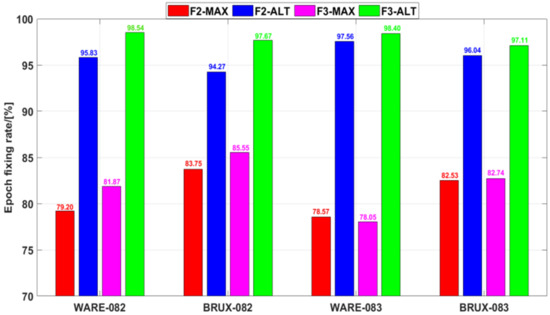 Figure 6 shows the epoch fixing rate of the UCPPP PAR approach, which includes F2-MAX, F2-ALT, F3-MAX, and F3-ALT solutions. For DOY 082 in the WARE station, compared with the results of the MAX method, the epoch fixing rate of the ALT method was improved by 16.63% (from 79.20% to 95.83%) in dual-frequency UCPPP PAR and by 16.67% (from 81.87% to 98.54%) in three-frequency UCPPP PAR. Similar results occurred on the other three modes: BRUX-082, WARE-083, and BRUX-083. F2-MAX showed the smallest epoch fixing rate, excluding WARE-083, whereas F3-ALT showed the largest epoch fixing rate. Additionally, the epoch fixing rate of F3-ALT was higher than that of F2-ALT. An average improvement of 2.04% can be achieved. Furthermore, the average epoch fixing rates were 81.01, 95.92, 82.05, and 97.93% for F2-MAX, F2-ALT, F3-MAX, and F3-ALT, respectively. Overall, on the one hand, the average epoch fixing rate in F2-MAX is slightly lower than in F3-MAX, while the F2-ALT is slightly lower than in F3-ALT. In contrast, the average epoch fixing rate of F2-ALT was large than that of F2-MAX, while that of F3-ALT was larger than that of F3-MAX. This indicates that the ALT method has an advantage over the MAX method in terms of the epoch fixing rate. Moreover, the three-frequency methods also have certain advantages over the dual-frequency methods.